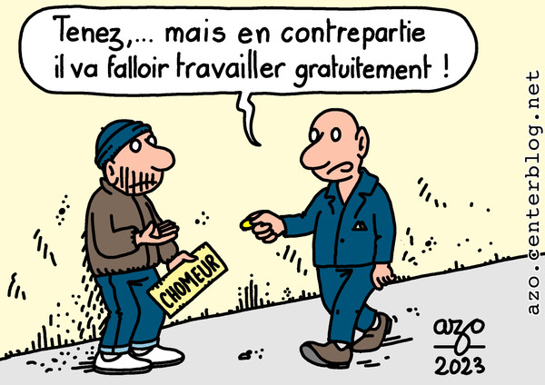 RechercherAvec France Travail, pour toucher leurs allocations, les allocataires du RSA, qui n'ont pas de boulot, devront faire un travail non rémunéré… piquant, du coup, à bas coût, le travail de ceux qui en ont et qui se retrouveront donc au chômage… et devront bosser gratuitement pour toucher leurs allocs.